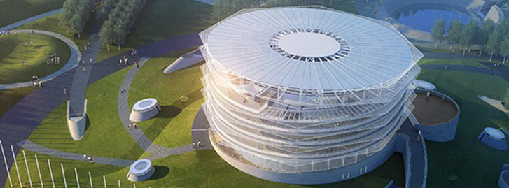 該項目西鄰青島路、東臨綠舟路、南鄰日照植物園,建筑高度34米,建筑面積1.8萬平方米,概算投資2億元。科技館設(shè)計中引入"黑洞"和"星空"的概念,作為"黑洞"的中心,所有的場地景觀及道路都圍繞這個中心沿螺旋狀放射形布置,暗示了整個場地的"力的源泉"都來自于科技館。